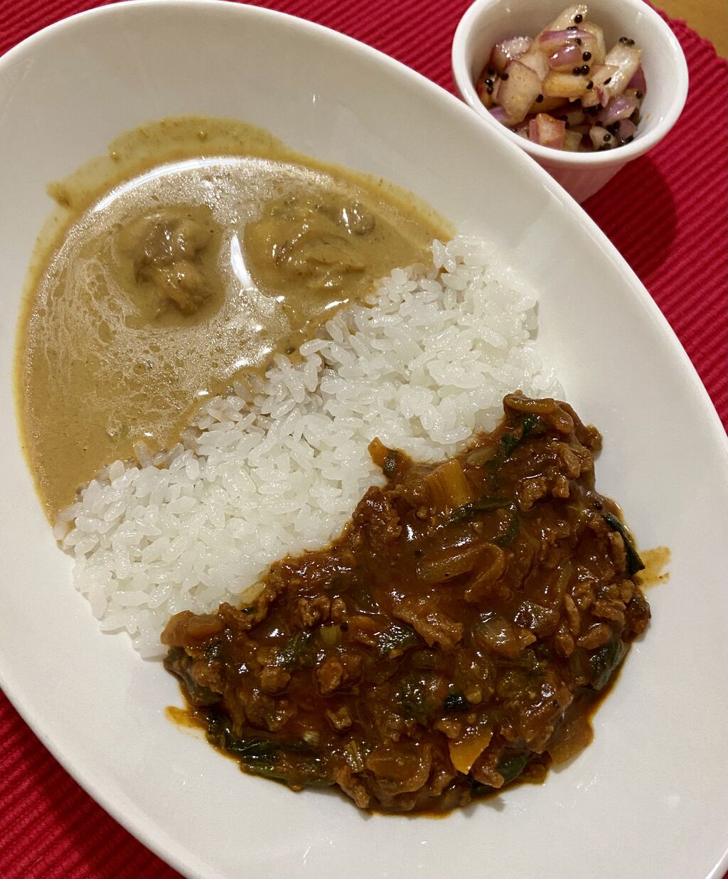 右がトマトとほうれん草のキーマカレーです。