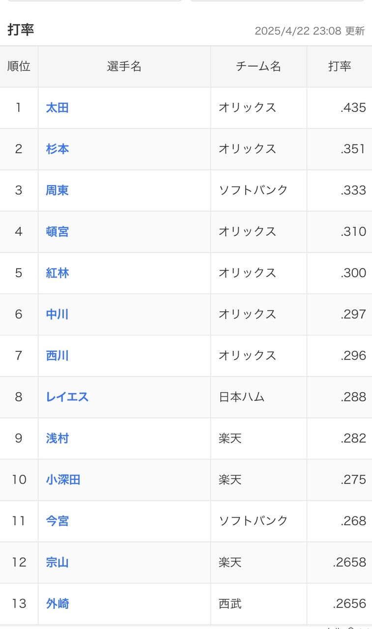 パ・リーグの打率TOP10に