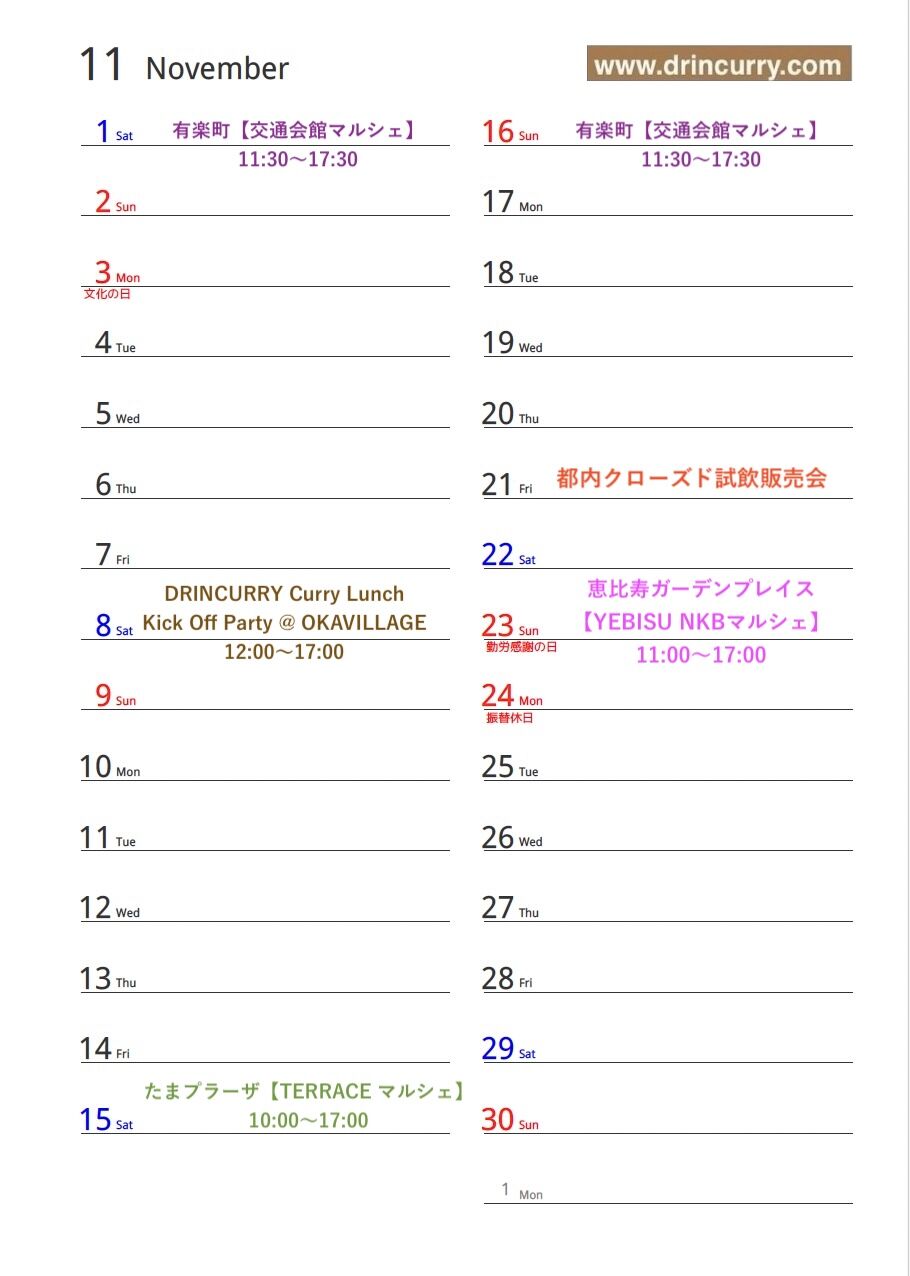 【11月のマルシェ出店スケジュール】の