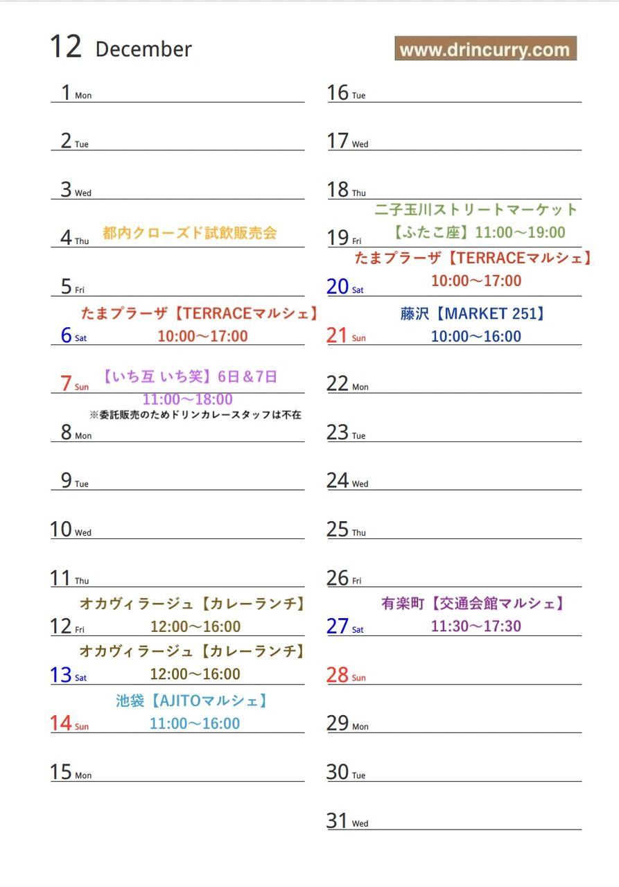 12月の【マルシェ出店スケジュール】の